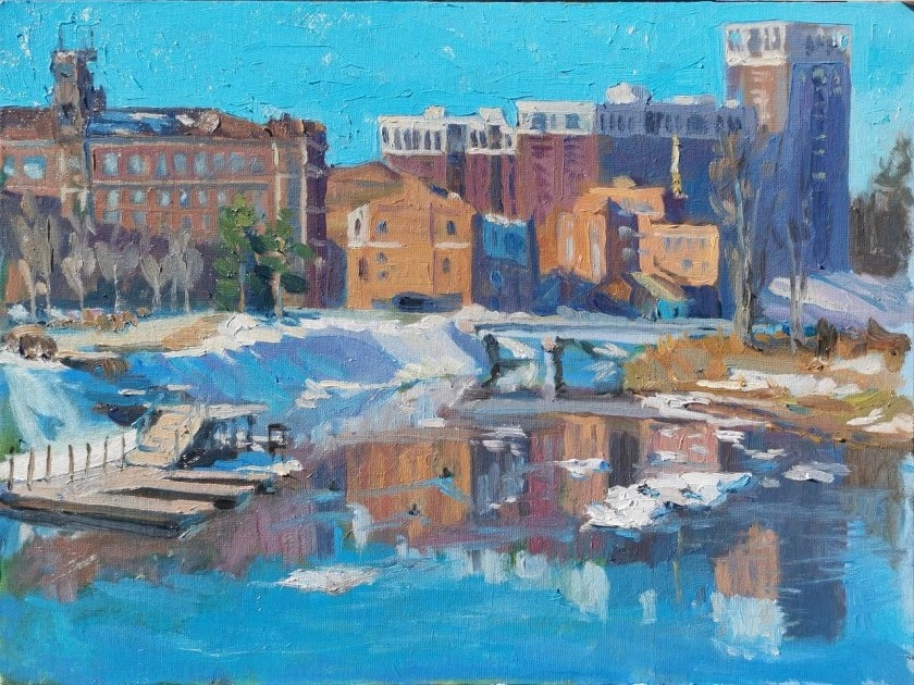 На его полотнах город раскрывается по-разному. Мартовская оттепель придает нежности обычным дворам, а декабрьское свечение в окнах переносит в детство. Каждый такой пейзаж превращается в воспоминание, согревающее изнутри.